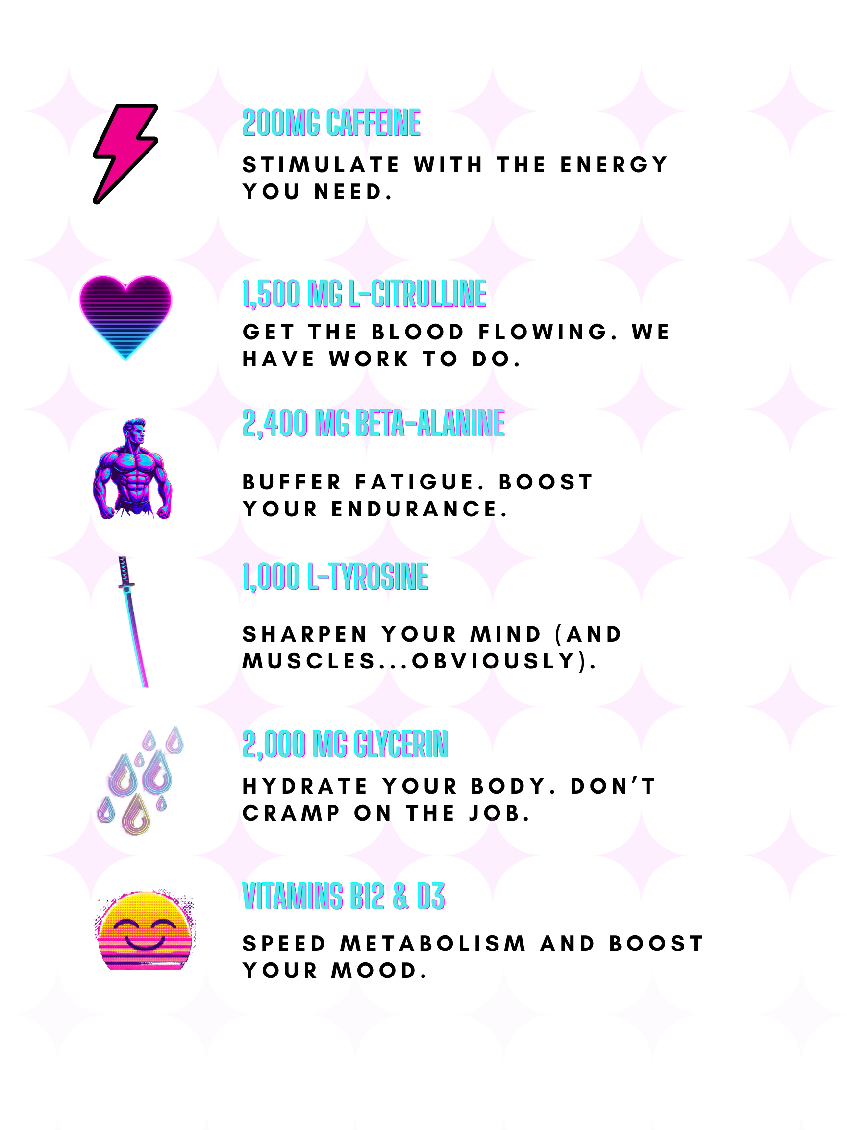 Caffeine, Beta-Alanine, L-Citrulline, L-Tyrosine, Glycerin & Vitamins B12 & D3.